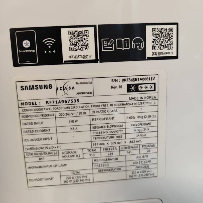 یخچال سامسونگ RF71 از 34 فوت بهره می برد که برابر با 844 لیتر می باشد و می تواند گزینه ای عالی برای خانواده های پرجمعیت باشد. این ظرفیت واقعی 844 لیتر برابر با 461 لیتر در بخش یخچال و 252 لیتر در بخش فریزر می باشد. هم فریزر و هم یخچال دارای دو درب می باشند که در جهتهای مخالف راست و چپ باز میشوند. هنگام باز کردن درب های قسمت یخچال شما متوجه 3 طبقه، 2 کشو و 6 طبقه در درب خواهید شد. در قسمت فریزر هم نیز 4 طبقه، 2 کشو و 6 طبقه در درب به چشم خواهد خورد. سامسونگ این طبقه و کشو ها را از بهترین و با کیفیت ترین متریال ساخته است بنابراین بسیار محکم می باشند و وزن بالای محصولات را نیز میتوانند به راحتی تحمل کنند. علاوه بر آن این قفسه ها بسیار جارادار نیز هستند و می توانید محصولات غذایی فراوانی را درون آن ها قرار دهید. همانطور که اشاره کردیم قسمت آبریز یخچال نیز در داخل یخچال و قسمت چپ قرار گرفته است و یک درب مخصوص به خودش را دارد که با باز کردن درب می توانید به آبی خنک برای نوشیدن دسترسی داشته باشید. همچنین یکی از قفسههای فریزر مخصوص یخ ساز میباشد و یخ های زیادی را به صورت مکعبی و حبهای در اختیارتان قرار خواهد داد. این یخ ساز به صورت روزانه 2.8 کیلوگرم یخ را در اختیارتان قرار خواهد داد. این یخچال شامل دو کشو Flex Crisper و Crisper میباشند که کمک میکنند مواد غذایی همچون میوهها و سبزیجات کاملاً سالم با طراوت بمانند. جنس شیشه این قفسهها نشکن می باشند و بسیار محکم است. ویژگی مثبت دیگر قابلیت Foldable Shelf می باشد که به تاشو نیز معروف است می توانید ارتفاع قفسه ها با توجه به اندازه مواد غذایی داخل یخچال تغییر دهید. درون یخچال و فریزر آن یک لامپ LED تعبیه شده است که از طریق آن می توانید فضای داخل یخچال را به خوبی مشاهده کنید.