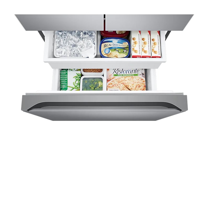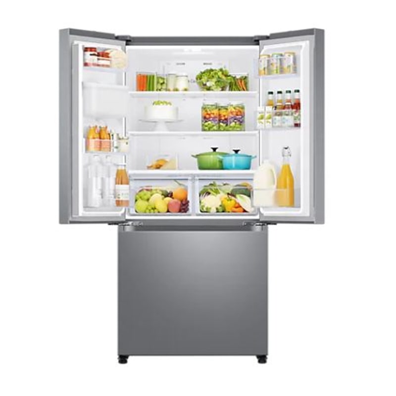 هر چقدر طراحی ظاهری یخچال ها اهمیت داشته باشد چند برابر آن ساختار داخلی ارزش دارد. طراحی داخلی می تواند نظم و انضباط قرار گیری مواد غذایی را در کالا تخمین بزند. یخچال فرنچ سامسونگ RF25 جمع و جور بسیار مرتب طراحی کرده اند. قسمت یخچال از دو عدد کسو چسبیده به هم که اندازه ای بزرگ دارد تهیه شده است. این کشوها می تواند حجم قابل توجهی از مواد غذایی را درون خود جای دهند. در ادامه سه طبقه بسیار بزرگ مشاهده می شود.