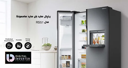 یخچال ساید بای ساید سامسونگ RS51 یکی از مدل های ساید بای ساید این شرکت با ظرفیت 30 فوت می باشد که به طراحی زیبا و امکانات متنوع معروف است. از گذشته تا به امروز بشر نیازمند وسیله ای برای خنک نگه داشتن مواد و جلوگیری از فساد آن بوده است. امروزه این وسیله با عنوان یخچال شناخته می شود. شرکت های زیادی در زمینه تولید یخچال فعالیت دارند. یکی از خوش نام ترین این شرکت ها سامسونگ بوده که در سال های اخیر محصولات باکیفیت و کارامدش زبانزد خاص و عام بوده است. این شرکت یخچال پر طرفدار RS51 را با قابلیت های جدید به بازار رقابت ها عرضه نمود. یخچال ساید بای ساید سامسونگ در ظرفیت 30 فوت معادل 547 لیتر (ناخالص) تولید شده که متناسب خانواده هایی با جمعیت بالا می باشد. طراحی شیک و جنس بدنه این محصول متناسب با دیزاین هر آشپزخانه ای بوده و این موضوع بر محبوبیت دوچندان آن افزوده است. استفاده از موتور اینورتر دیجیتال جهت صرفه جویی بیشتر در مصرف انرژی، کلاس آب و هوا T برای تولید سرمای بیشتر در مناطق گرم تر و همچنین گاز مبرد R600a بر کیفیت بالای یخچالRS51 تاکید دارد. انجماد سریع و قابلیت بدون برفک، میزان نویز پایین، قفل کودک، سنسورهای دیجیتال جهت کنترل دما، زنگ هشدار، فیلتر بهداشتی هوا، سیستم خنک کنندگی TwinCooling Plus و جریان هوای سرد Multi Flow از دیگر امکانات یخچال فریزر ساید بای ساید سامسونگ هستند.