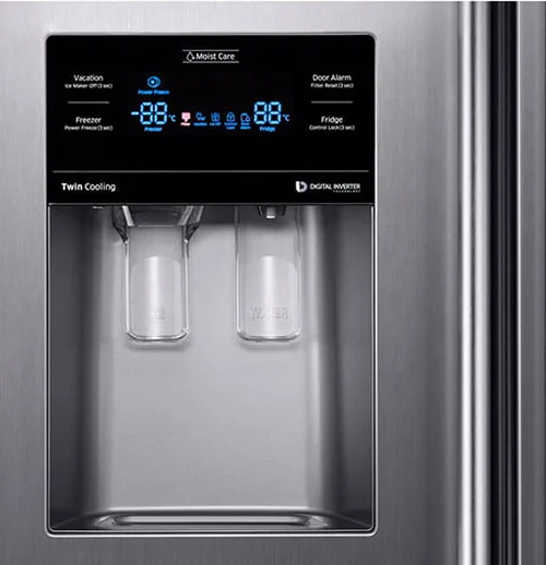 با نگاهی ساده از رو به رو به بدنه ی یخچال ساید بای ساید سامسونگ مدل RS51 متوجه وجود آبریز و یخساز آن خواهید شد.این آبریز علاوه بر کارایی عالی که دارد بر زیبایی دستگاه نیز افزوده است.آبریز یخچال مدل RS51K57807S قادر است تا به بهترین شکل ممکن بدون نیاز به باز کردن درب های یخچال آب سرد و یخ هایی فوق العاده را درون لیوانتان بریزد.همچنین قادر است تا دو نوع یخ به صورت ریز یا مکعبی تهیه کند و به کاربر تحویل دهد.انتخاب هر کدام از این دو نوع یخ از روی نمایشگر آبریز امکان پذیر است.طراحی این محفظه بر اساس استاندارد است و هر نوع لیوان با هر ارتفاعی که باشد را می توان در این محفظه ی آبریز قرار داد.تنها کافی است که لیوان را زیر آبریز بگیرید و دکمه را فشار دهید.آبریز یا همان آبسرد کن این ساید بای ساید RS51 بر روی بدنه ی بخش فریزر دستگاه قرار داده شده است و قابلیت اتصال به آب شهری را دارد یعنی برای پر از آب شدنش نیازی نیست تا کاربر خود محفظه را پر نماید بلکه به صورت اتوماتیک پر از آب خواهد شد.در بالای آبسرد کن یک صفحه نمایشگر از نوع LED لمسی وجود دارد که با استفاده از آن می توان تنظیمات دمایی RS51K57807S را برای هر کدام از بخش های یخچال و فریزر انجام داد و مشاهده نمود.