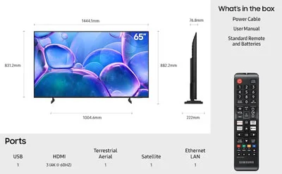 تلویزیون سامسونگ 65 اینچ مدل U7000F محصول سال 2025 است و با نمایشگر تخت و با بدنه خوش طرح و زیبا تولید شده است. این تلویزیون کیفیت تصویر 4K دارد و از پنل کریستالی با پردازنده Crystal نیز بهره مند میباشد. رفرش ریت 60 هرتز دارد. سیستم صوتی 20 وات از نوع دو کاناله برای آن ساخته شده و صدای درخور و هماهنگ با تصویر عالی دارا است. هوشمند بودن دیگر ویژگی تلویزیون سامسونگ با نمایشگر 65 اینچ محسوب میشود و سیستم عامل تایزن و قابلیت اتصال به اینترنت برای آن قرار داده شده است.