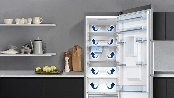 قرار دادن انواع بطری و شیشه با اندازه های مختلف می تواند مشکل هر کدبانویی باشد. با نگاه کردن به فضای داخلی و قفسه های آن بر روی درب یخچال متوجه طبقات متنوع آن می شوید. طبقات آن طوری طراحی شده که می توان هر نوع بطری و شیشه را با اندازه های مختلف در یخچال جا داد. در واقع درب یخچال دو قلو سامسونگ به شیوه ای طراحی شده که با امکان تنظیم کردن آن می توانید محتوای بسیار بیشتری را در داخل قفسه های آن ذخیره سازی کنید. فضای مورد نیاز برای بطری های بزرگ، کارتن و سایر موارد را به دلخواه خود تنظیم کنید و با مدیریت آن از فضای بیشتری برخوردار شوید.