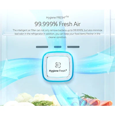 فناوری های پیشرفته در یخچال ال جی X24 کره فیلتر Hygiene Fresh به طور خودکار هوای داخلی خود را تمیز و تصفیه می کند و از تازه و بهداشتی بودن هوای داخل اطمینان حاصل می کند. یخچال فریزر ال جی x24 سیستم فیلتر پنج مرحله ای آن به طراوت بیشتر غذا کمک می کند. نهایت راحتی برای آشپزخانه شما با سیستم ذخیره سازی هوشمند گروه بندی انواع خاصی از مواد غذایی را برای سازماندهی نهایی آشپزخانه آسان می کند. اکنون ، به سادگی دوبار روی شیشه ضربه بزنید تا محتویات داخل آن بدون از دست دادن هوای سرد روشن شود. با استفاده از InstaView درب LG به راحتی موارد دلخواه خود را پیدا کرده و به آنها دسترسی پیدا کنید. با دو ضربه سریع روی صفحه شیشه ای آینه ای براق ، داخل محفظه دسترسی سریع و آسان برای تنقلات و نوشیدنی های مورد علاقه خود را بدون باز کردن درب مشاهده کنید ، کاهش از دست دادن هوای سرد برای حفظ طراوت بیشتر غذا. Hygiene Fresh به طور خودکار هوای داخلی خود را تمیز و تصفیه می کند و از تازه و بهداشتی بودن هوای داخل اطمینان حاصل می کند. سیستم فیلتر پنج مرحله ای آن به طراوت بیشتر غذا کمک می کند.