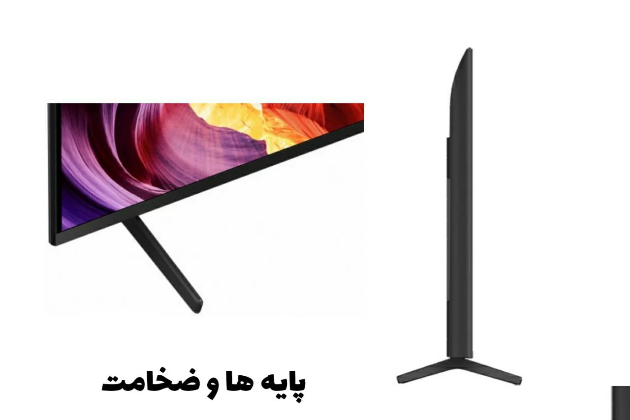این تلویزیون 55 اینچ سونی دارای پایه های دو شاخه ای می باشد که در اطراف تلویزیون قرار می گیرد. این پایه ها از جنس فلز می باشد که بدون هیچ حرکتی و ثابت وزن تلویزیون را تحمل می کنند. این پایه های دو شاخه ای به دلیل عریض بودن باید روی میز بزرگی قرار گرفته شوند. این پایه ها مشکی رنگ می باشد و جز پایه های مدرن و جذاب قرار می گیرند. البته برند سونی این تلویزیون را با قابلیت نصب بر روی دیوار عرضه کرده است و شما می توانید با حذف پایه های تلویزیون و به وسیله براکت مناسب ان را بر روی دیوار نصب کنید. نصب تلویزیون به وسیله براکت ها بسیار ساده می باشد و جلوه ای مرتب و مدرن را در هر فضای ایجاد خواهد کرد. در رابطه با ضخامت بدنه آن باید گفت که جز تلویزیون های باریک محسوب نمی شود و ضخامت بدنه آن 6.9 سانتی متر می باشد. با این حال تلویزیون جلوه شیک و جذاب خودش را حفظ کرده است. بدنه و پایه های این تلویزیون از استحکام فوق العاده برخوردار می باشد و در رنگ مشکی عرضه بازار شده است.