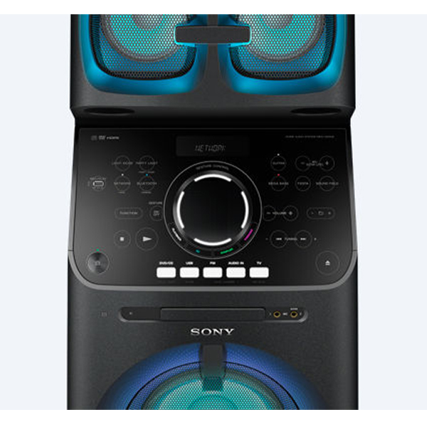 سیستم صوتی شیک V90 سونی دارای فشار صوتی عظیم با سیستم که بسیار عال برای مهمانی بزرگ با 10 بلندگو و چراغ مهمانی به سبک باشگاه از صدا با زاویه وسیع تر با پخش کننده صدا لذت ببرید. همچنین میکروفون و ورودی های مخصوص گیتار ، بنابراین می توانید مهمانی های خود را بخوانید و پخش کنید. با کنترل حرکت از جلوه های DJ و نیز با پشتیبانی از برنامه مرکز موسیقی ، به راحتی از موسیقی در هر نقطه لذت ببرید. چرخ و دسته برای حرکت آسان که می توان آن را به راحتی جا به جا کرد. همچنین از طریق بلوتوث و NFC برای اتصال بی سیم و از همه موسیقی های مورد علاقه خود از طریق USB لذت ببرید. ساندبار سونی MHC-V90DW همه چیزهایی را که برای یک شب باورنکردنی نیاز دارید ، دارد: چراغ های سبک باشگاه ، ویژگی های مهمانی سرگرم کننده و صدای عالی از 10 بلندگو را به گوش کاربران خود می رساند. چراغهای مهمانی روشن را روشن کنید ، صدای خود را به ترکیب اضافه کنید و از Gesture Control برای ایجاد جلوه های صوتی DJ استفاده کنید.پخش آسان بی سیم با استفاده از BLUETOOTH با جفت شدن فوری NFC متصل شوید ، یا از خدمات جریان از طریق Wi-Fi استفاده کنید. پخش کننده DVD به شما امکان می دهد از صدای بلند با فیلم های خود لذت ببرید. از HDMI برای ارسال سیگنال ویدئو به تلویزیون خود استفاده کنید.