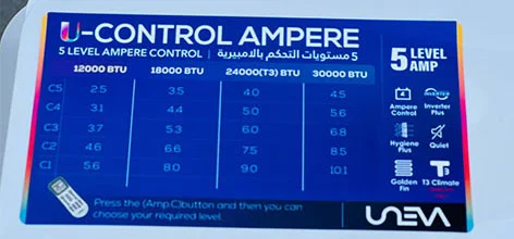 یکی از قابلیت های جدید که در کولر گازی یونیوا وجود دارد سیستم کنترل آمپر یا همان آمپر کنترل U-Control Ampere میباشد. نوسانات برق و جریان آن بر روی عملکرد کولر گازی تاثیر دارد. یونیوا با قرار دادن این سیستم نوسانات برق را کنترل میکند. امکان تنظیم سطح آمپر به کاربران داده شده و کاربر میتواند آن را در سطوح مختلف با توجه به نوسانات برق تنظیم نماید. با وجود چنین سیستم در مصرف برق صرفه جویی میشود. در شرایطی که برق ضعیف است با قرار دادن آمپر دستگاه در سطح پایین هم امکان استفاده از کولر گازی وجود دارد و هم بر روی برق فشار وارد نخواهد شد و امکان روشن ماندن کولر گازی و سایر دستگاه های برقی در خانه و محل کار وجود خواهد داشت.